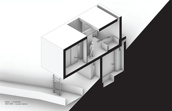 Fall 2023: This project is a sauna for two people located in Noboribetsu, Japan (in an area known as Jigokudani or “Hell Valley”), known for its natural hot springs. I attempted to give each person a separate, similar (but not identical) experience, where the only shared time in the procession is on the path leading to the structure, utilizing levels connected by ladders to separate and almost mirror the experiences of each visitor.